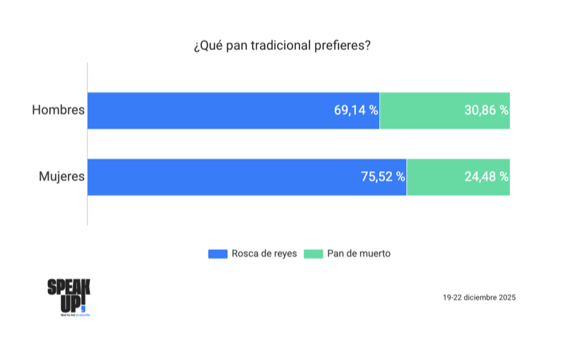 La preferencia por la rosca es mayoritaria tanto en mujeres como en hombres, aunque con ligeras variaciones. Entre las mujeres, 75.52% se declara a favor de la rosca de reyes, mientras que 24.48% prefiere el pan de muerto. En los hombres, la rosca también lidera con 69.14%, aunque el pan de muerto gana algo más de terreno, con 30.86%.
