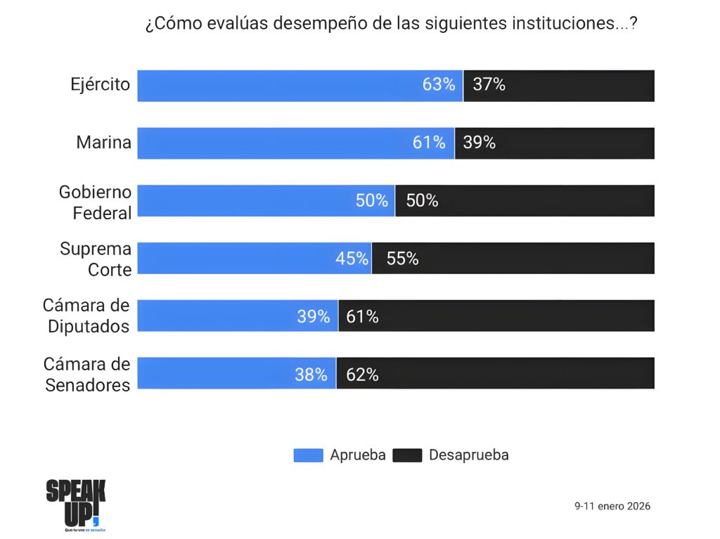 En contraste, el Gobierno Federal divide opiniones: 50% aprueba su desempeño y 50% lo desaprueba. La Suprema Corte enfrenta una evaluación más crítica, con 45% de aprobación y 55% de desaprobación pese a la reciente reforma judicial, mientras que el Congreso aparece como el bloque institucional peor evaluado. La Cámara de Diputados registra 39% de aprobación frente a 61% de desaprobación, y la Cámara de Senadores 38% aprueba contra 62% que desaprueba.