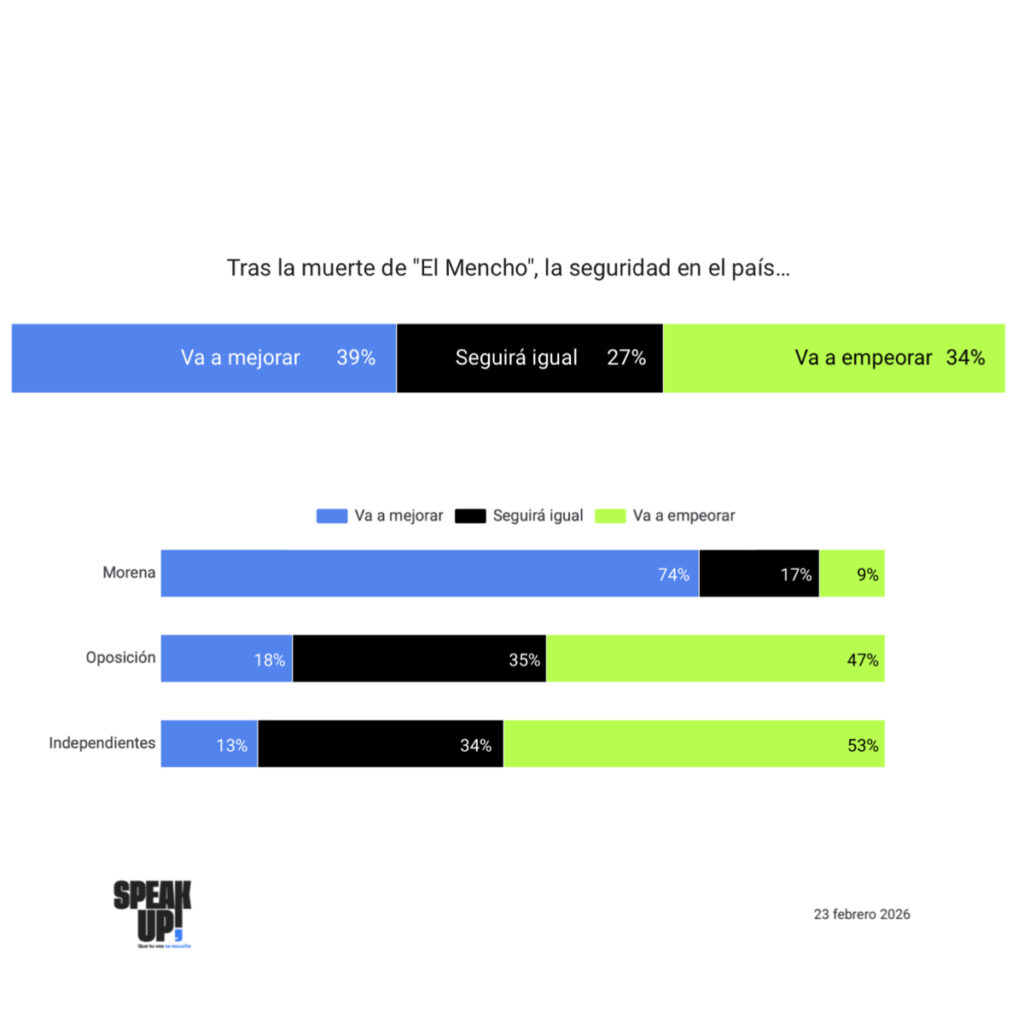 Sin embargo, la atención no se traduce en una lectura uniforme sobre el impacto que tendrá en la seguridad del país. Ante la pregunta sobre qué ocurrirá en el futuro cercano, 39% cree que la seguridad va a mejorar, mientras 34% piensa que va a empeorar y 27% dice que seguirá igual.