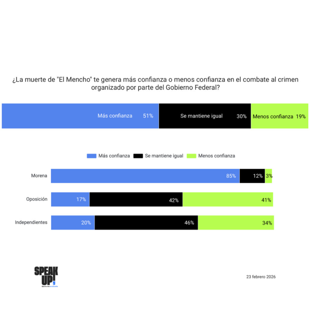 Ese patrón se repite cuando se pregunta sobre la confianza en el combate al crimen organizado. En términos generales 51% dice que la muerte de “El Mencho” le genera más confianza en las acciones del Gobierno Federal, 30% expresa que su confianza no cambia y 19% señala menos confianza