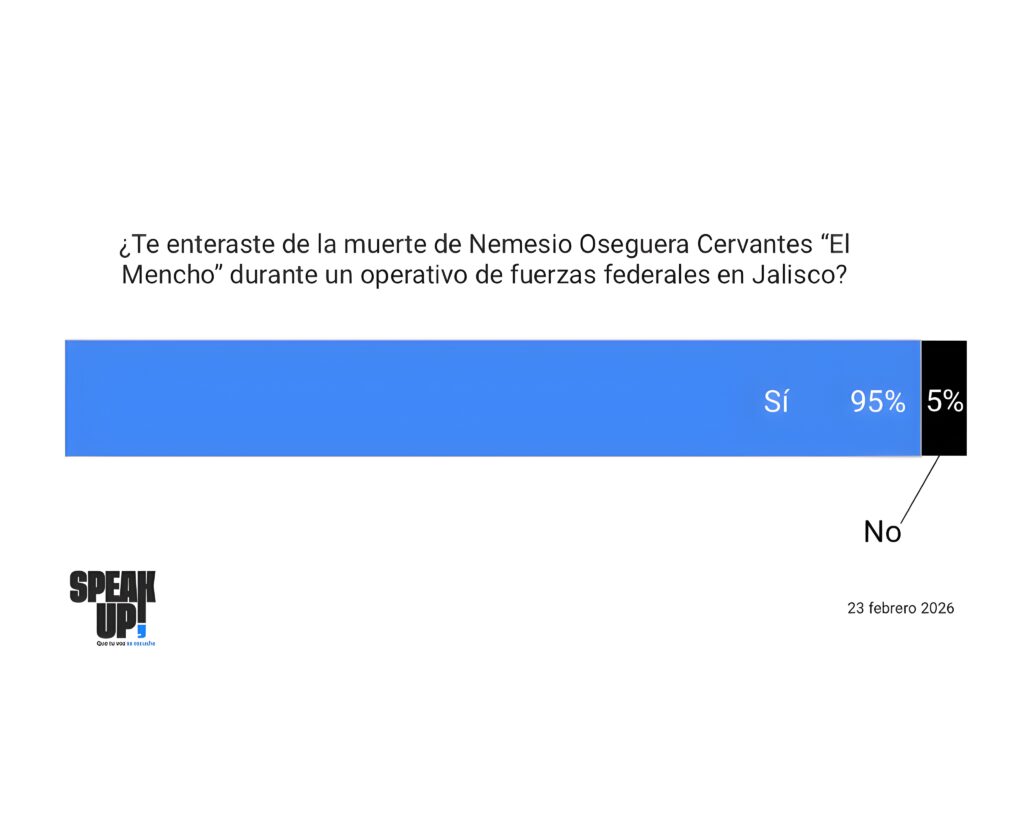 La noticia de la muerte de Nemesio Oseguera Cervantes, “El Mencho”, fue un suceso de alcance nacional: el 95% de los mexicanos afirma haberse enterado del operativo en Jalisco, frente a apenas 5% que no lo sabía.